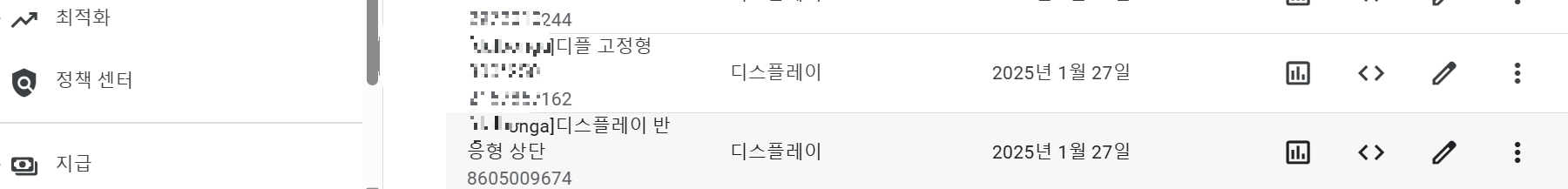 아래 화면은 수동 광고를 저장한 일부분이다. 수동 광고는 한 번 저장해 두면 필요할 때마다 <>(코드 가져오기)를 클릭 복사하기- HTML창에 붙여 넣기 하여 사용할 수 있습니다.